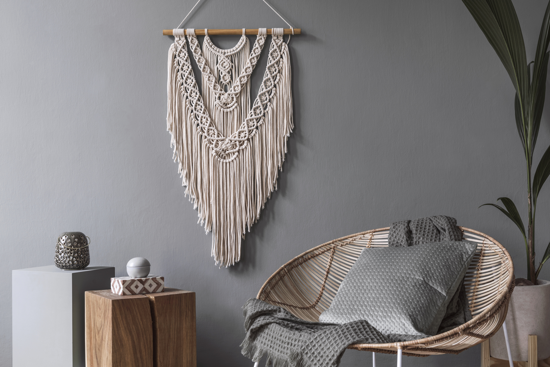 Modern boho interior design of sitting room with design rattan armchair,coffee table, beige macrame, tropical plants and elegant accessories. Stylish home decor. Template. Copy space. Home staging. Written by AtinteriorAdmin on 2020年10月15日. Previous