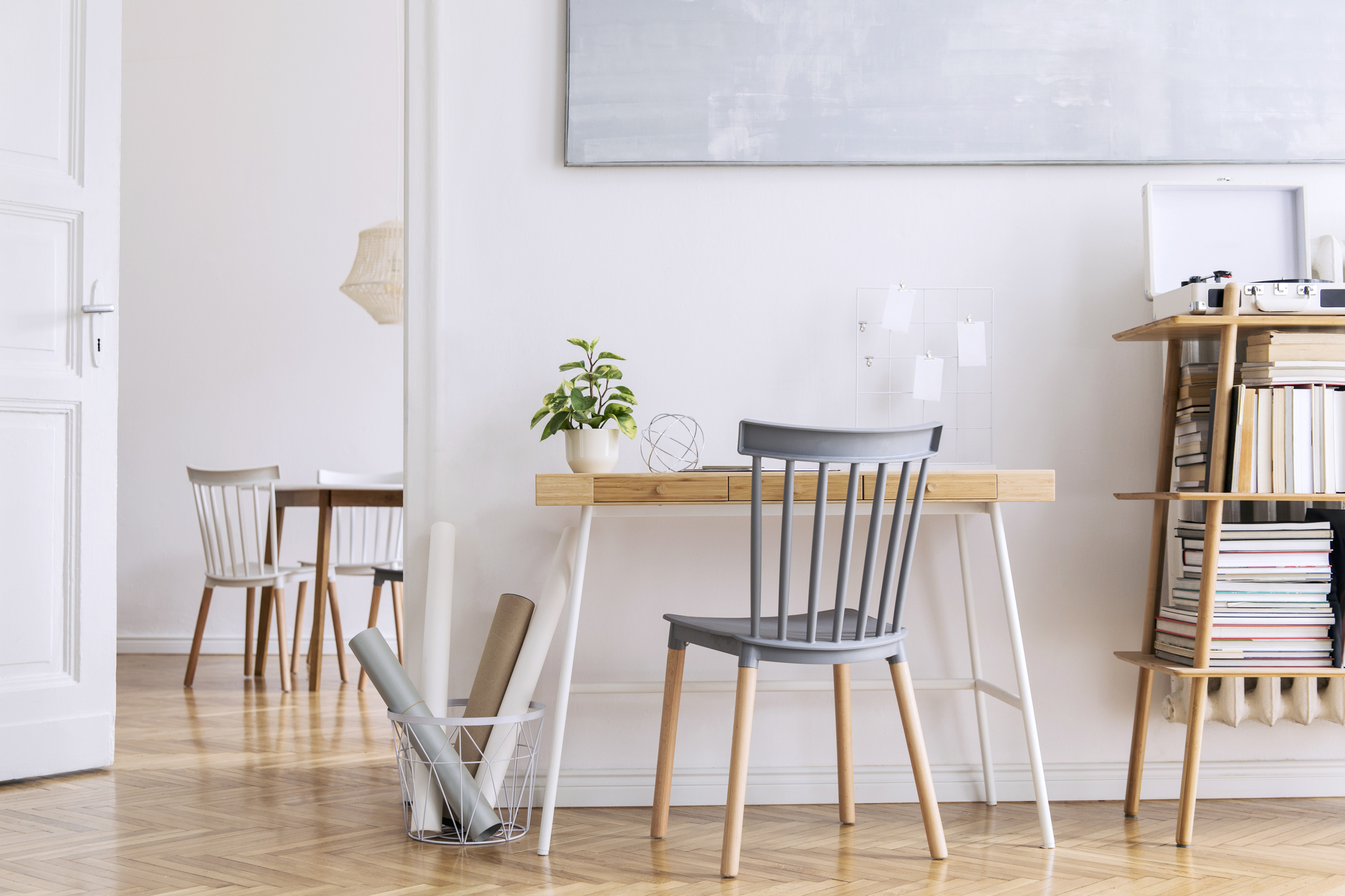 Modern scandinavian home decor of interior with creative wooden desk, bamboo bookstand with accessories, books and plants Open space and living room. Brown wooden parquet and stylish carpet. Written by AtinteriorAdmin on 2020年10月15日. Previous