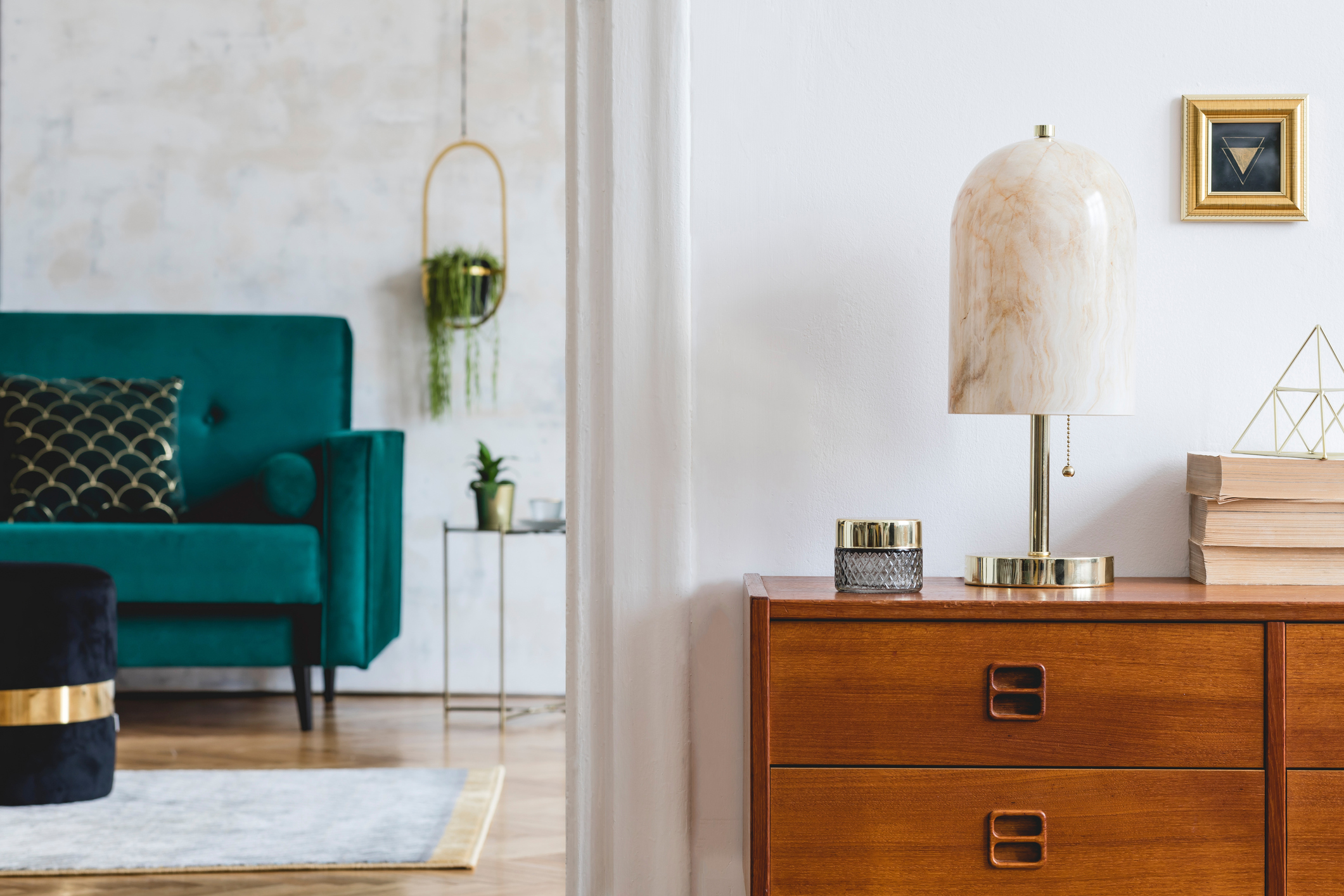Stylish composition of open space interiors with wooden commode, velvet sofa, marble table lamp, books, black pouf, plants, gold photo frame and elegant accessories. Modern design interior. Template. Written by AtinteriorAdmin on 2020年10月15日. Previous